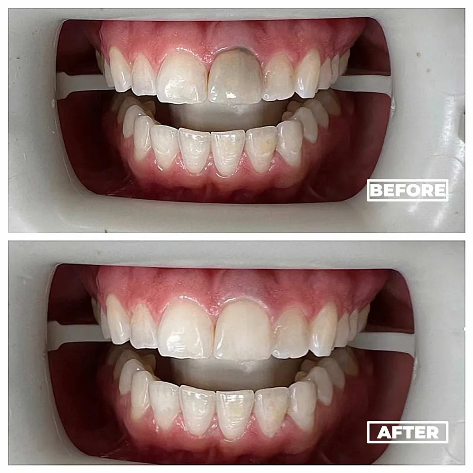 Dark stains removed with teeth whitening treatment.