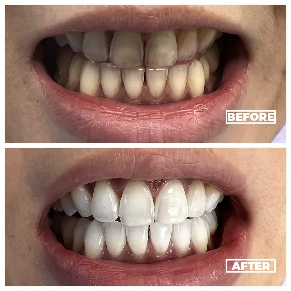 Yellow-stained teeth brightened with whitening treatment.