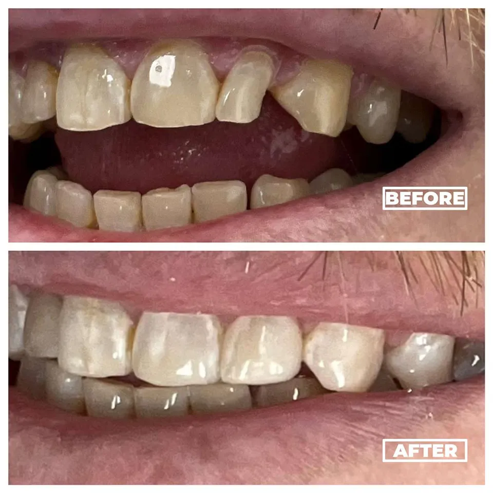 Chipped and uneven teeth repaired with cosmetic bonding.