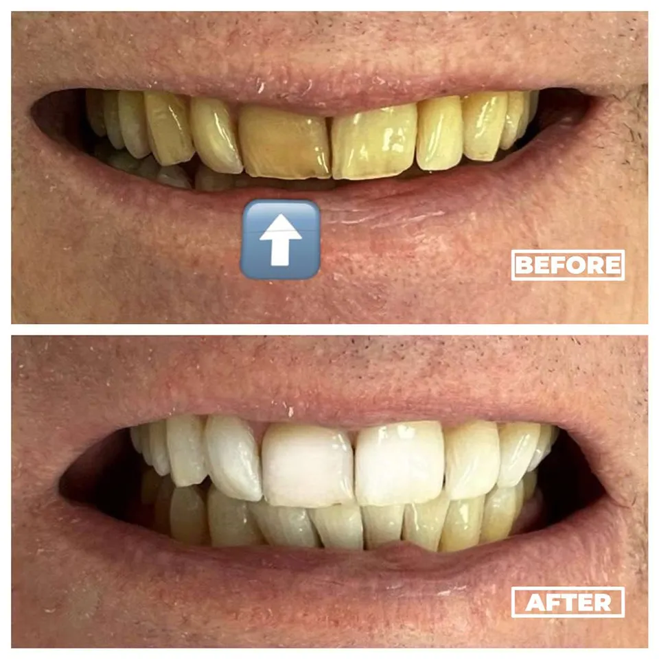 Heavily stained teeth restored with whitening treatment.